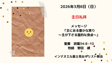 | インマヌエル富士見台キリスト教会 177-0034 東京都練馬区富士見台2-9-9 牧師 野田禎(ただし) 容子 03-3990-5963 教会はバリヤーフリー 車椅子のまま入れます。 手話通訳も可能です。 ほじょ犬は一緒に入れます。 |
